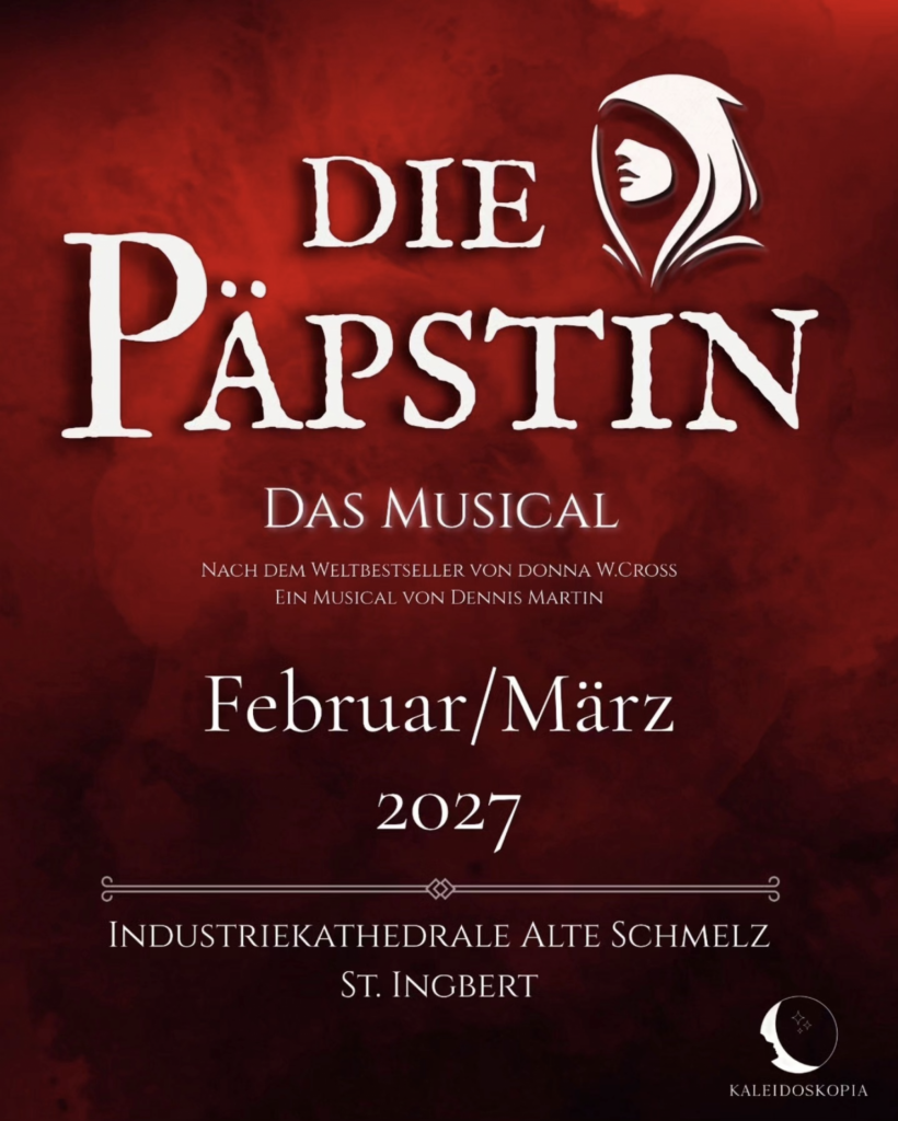 Das Kulturunternehmen KALEIDOSKOPIA bringt nach Erfolgen wie „Dracula“, „The Addams Family“ und „A Christmas Carol“ das Musical „Die Päpstin“ (nach dem Roman von Donna W. Cross) auf die Bühne im Saarland. Die Geschichte erzählt eindrucksvoll vom außergewöhnlichen Weg einer Frau gegen gesellschaftliche Widerstände.