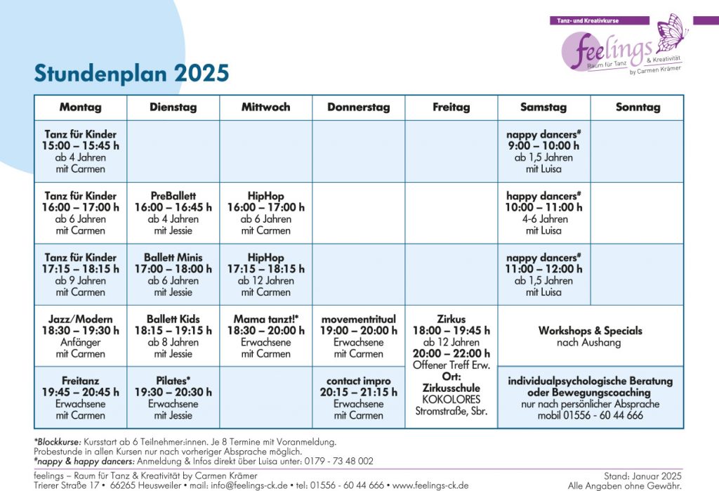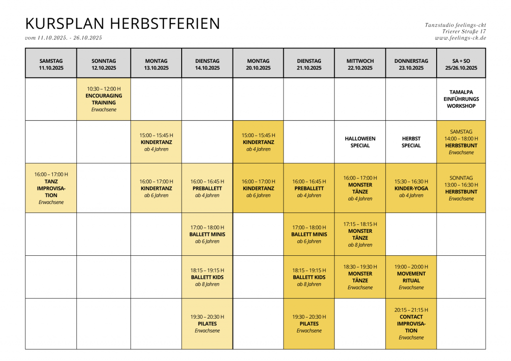 Der Ferienkursplan tritt vom 11.10. – 26.10.2025 in Kraft und ersetzt in dieser Zeit unseren regulären Stundenplan. Ab Montag, 27.10.2025 gilt der o.s. reguläre Stundenplan wieder.