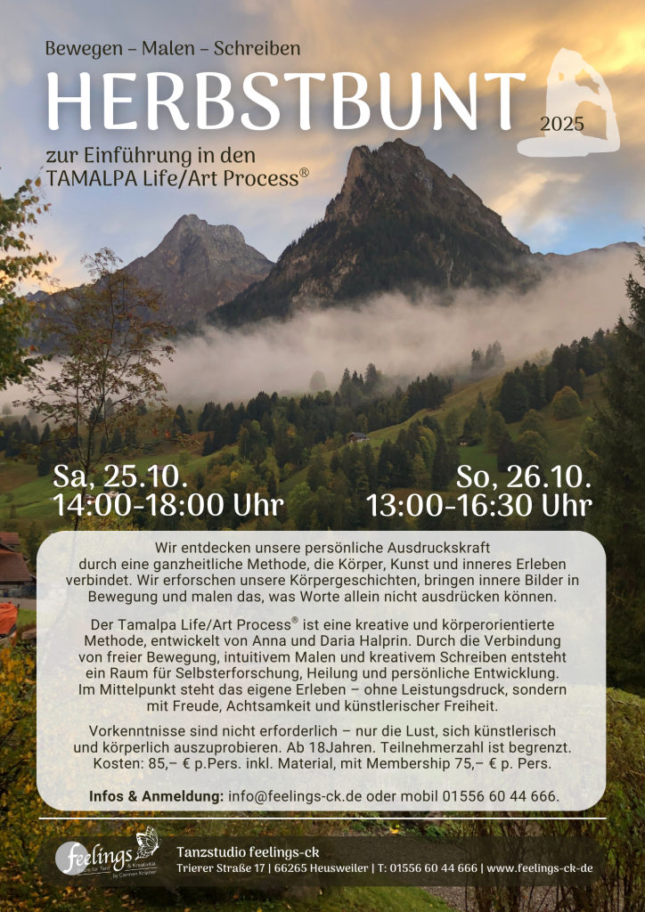 Ein besonderes Bonbon ist unser Tamalpa Life/Art Process® Einführungsworkshop für alle ab 18 Jahren sein. Lernen Sie diese körperorientierte Methode nach Anna und Daria Halprin kennen und tauchen Sie mit uns zwei Tage in die kreative Welt des Malen, Schreibens und Bewegens ein.
