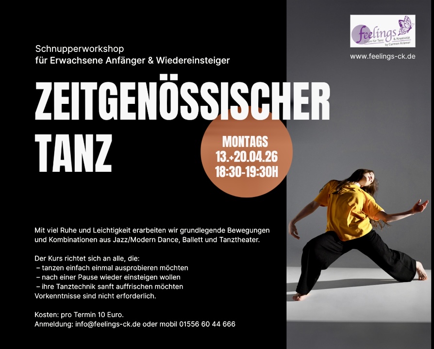 In diesem Schnupperworkshop tauchen wir gemeinsam in die Welt des zeitgenössischen Tanzes ein. Mit viel Ruhe und Leichtigkeit erarbeiten wir grundlegende Bewegungen und Kombinationen aus Jazz/Modern Dance, Ballett und Tanztheater.